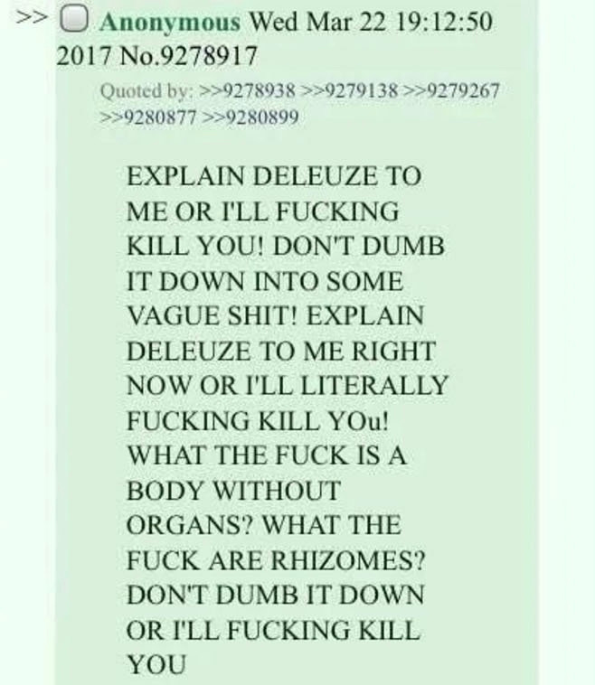 For Deleuze and Guattari, this describes or explicates (but never explains!) something about Kafka’s relationship to “justice,” which is really just another name for vying modes of desire.